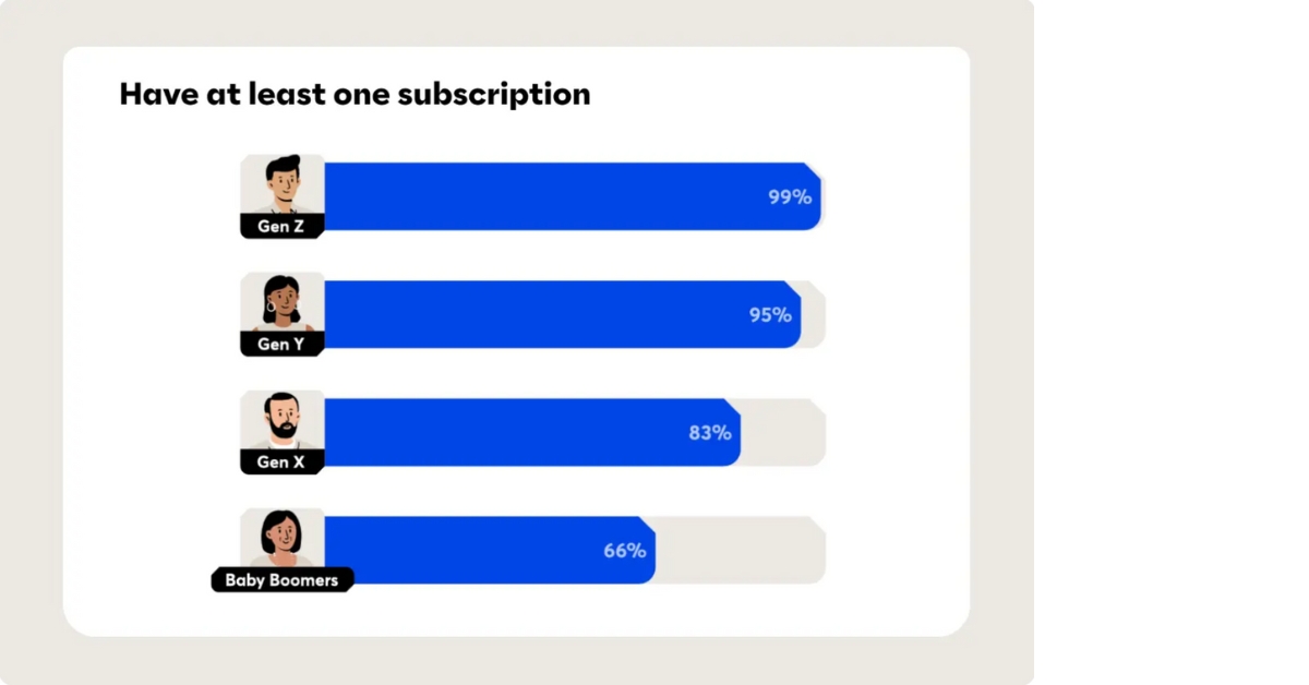 As digital natives, younger generations are the most enthusiastic adopters of subscription services. Almost half of Gen Z (48%) say they love or like subscriptions, compared to just 12% of Baby Boomers. Yet despite being less enthusiastic, older generations are still active users. More than four in five Gen X (83%) and two in three Baby Boomers (66%) hold at least one subscription. In contrast, subscriptions are near-universal among younger cohorts, with almost all of Gen Z (99%) and the vast majority of Gen Y (85%) signed up to at least one.