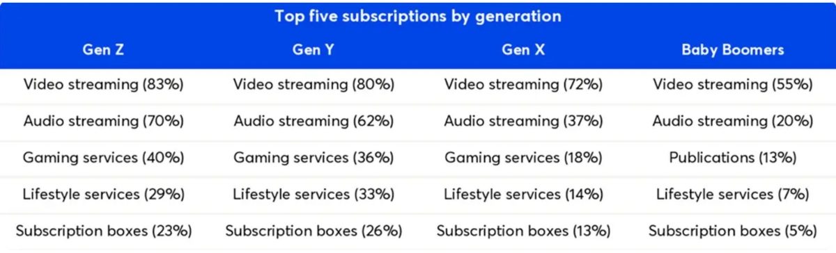 The most common subscription service to use across the generations is video streaming, followed by audio streaming. Gaming services are also common among Gen Z, Gen Y and Gen X, however publications are the next most popular service for Baby Boomers.